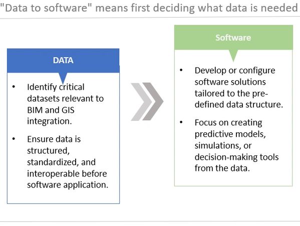 "Data to software" involves using data as input to develop or enhance software, emphasizing the creation of knowledge or models from data.